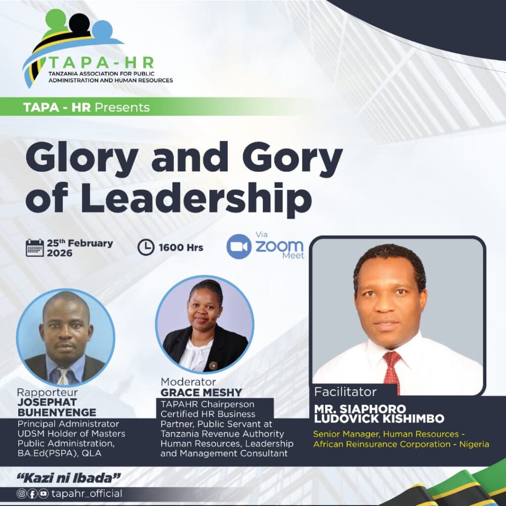 Tanzania Association For Public Administrators and Human Resources (TAPA – HR) is inviting you to a scheduled Zoom meeting. Topic: Glory and Gory of Leadership Time: Feb 25, 2026 04:00...